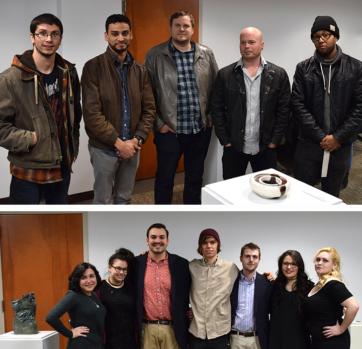 The Third Annual Juried Art Exhibit was hosted by The Rowan Arts Collective in the Chamberlain Student Center on April 5th. This year's jurors were Timothy Belknap and Ryan McCartney from the Icebox Gallery in Philadelphia. The top photo documents the winners and jurors (left to right): John Bussott (Third Place); Nick Vicente (Second Place); Timothy Belknap (Juror); Ryan McCartney (Juror); and Khalif Church (First Place). The second photo is the 2015-2016 TRAC Executive Board BOARD (left to right): Nicole Eadie, Dylan Weiss, Justin Visentin, Brent Galen Adkins, Ben Webster, Rylee Jacobs, Sarah Hay